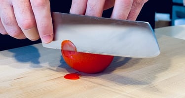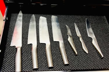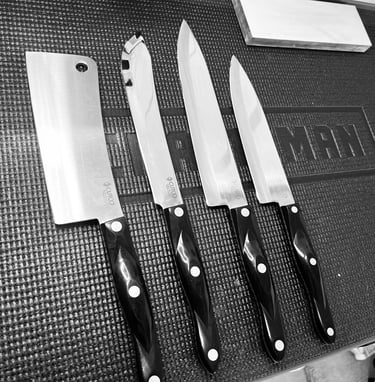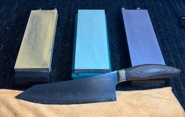Knives sharpened by hand - using the right sharpening stones, not machines or belts, for edges that are precise, consistent, and long-lasting.